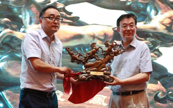 股份公司副總裁王衛(wèi)平代表公司向編委會致賀詞,并作為東道主回贈中西醫(yī)結(jié)合心腦血管病雜志編委會《八駿雄風(fēng)》木雕禮品。